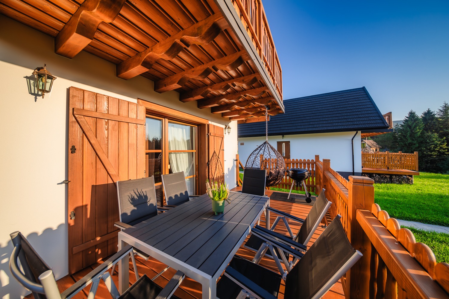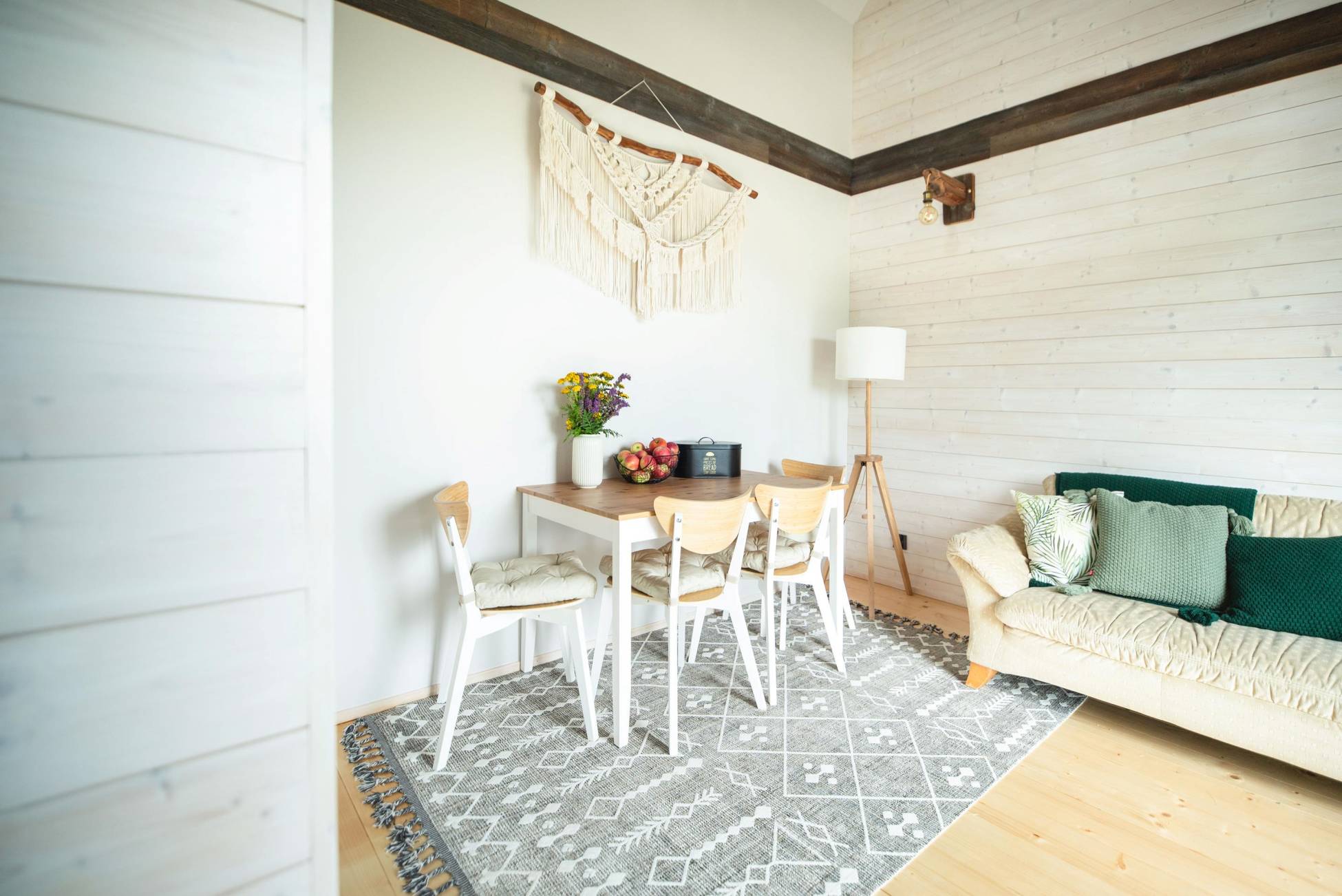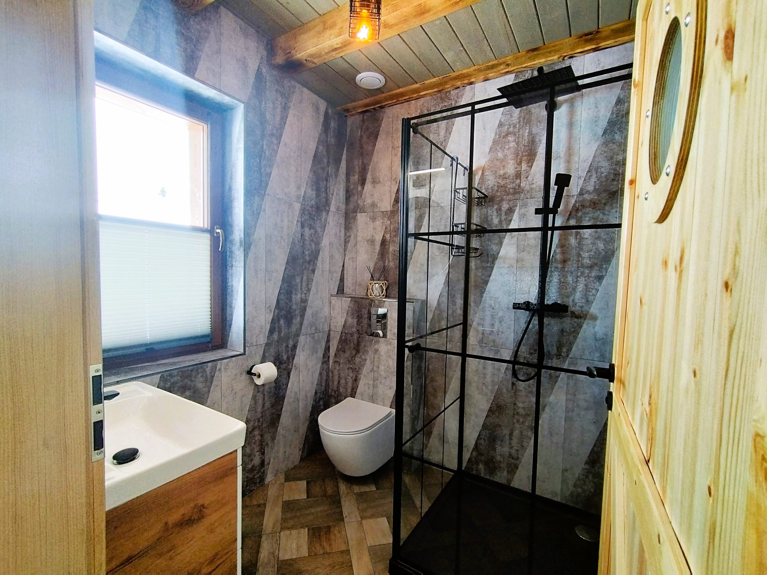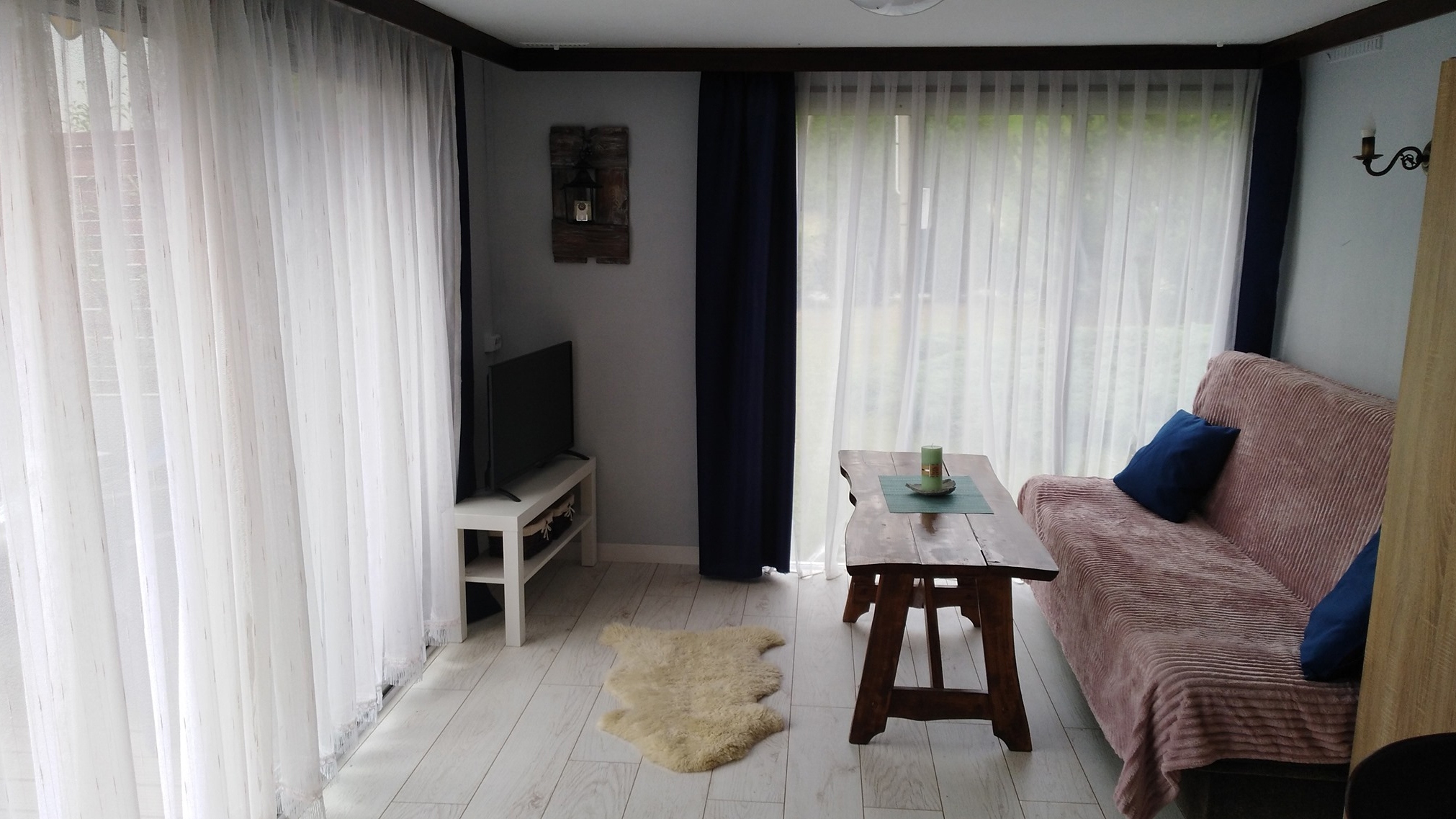 Domki są przestronne i pomieszczą 8 osób. Każdy z domków składa się z dwóch sypialni na piętrze, łazienki z prysznicem oraz salonu z aneksem kuchennym na parterze. Kuchnia jest kompletnie zaopatrzona i zawiera wszystkie niezbędne przybory i sprzęty kuchenne. Sypialnie wyposażone są w wygodne i wysokiej jakości materace, które zapewniają komfortowy wypoczynek po aktywnie spędzonym dniu. Na życzenie, zapewniamy łóżeczka turystyczne dla najmłodszych pociech. W salonie znajduje się wygodna rozkładana kanapa oraz telewizor z dostępem do Netflixa, co zapewni rozrywkę w chłodne wieczory. Ośrodek oferuje także przestronne tarasy oraz balkony i bezpłatne miejsce parkingowe dla każdego z domków. Na tarasie znajdują się meble ogrodowe, huśtawka oraz grill.