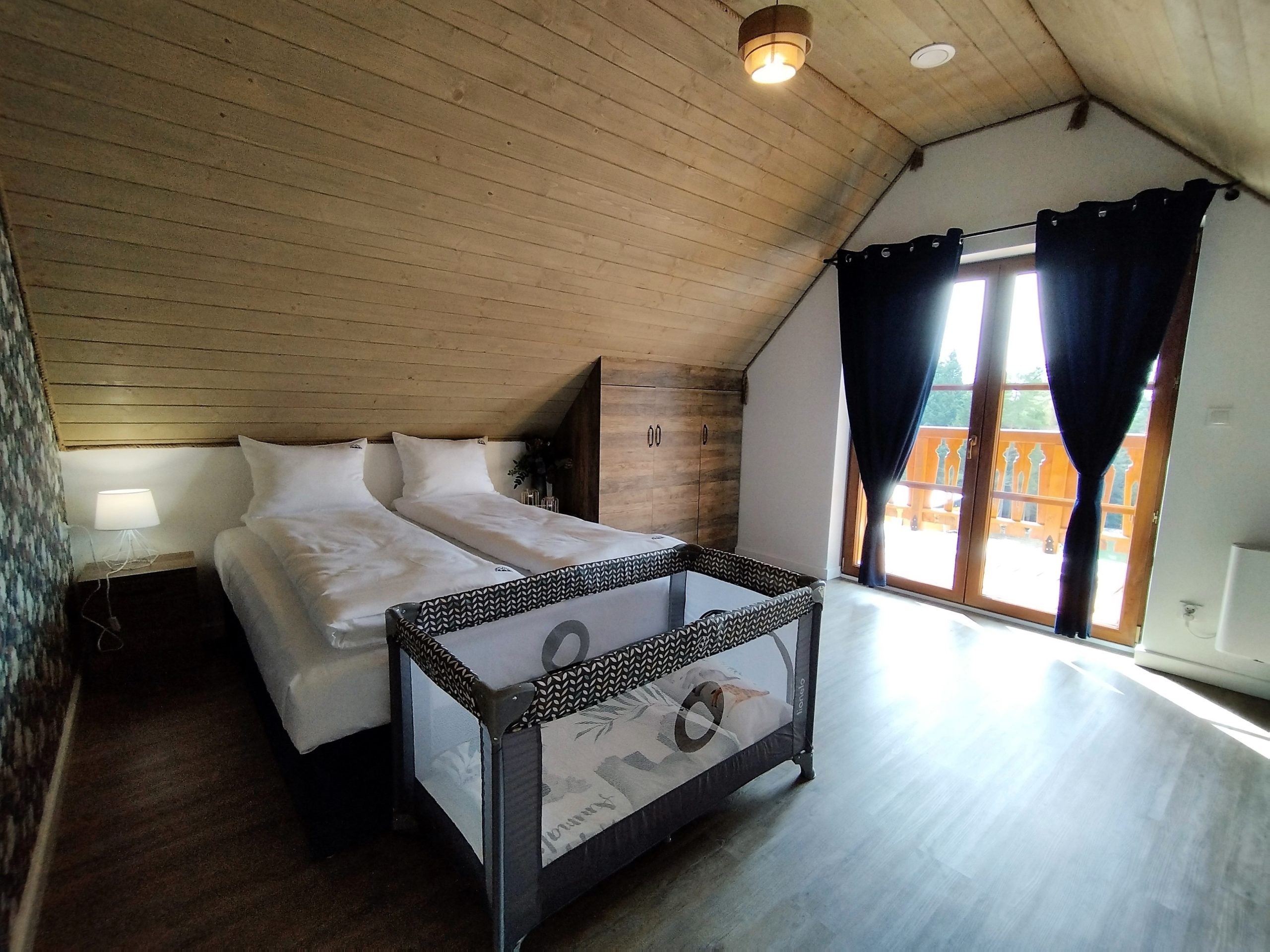 • Pokój nr 3: Dwuosobowy z pojedynczymi łóżkami i wspólną łazienką. Posiada wyjście na taras z widokiem na Ćwilin.