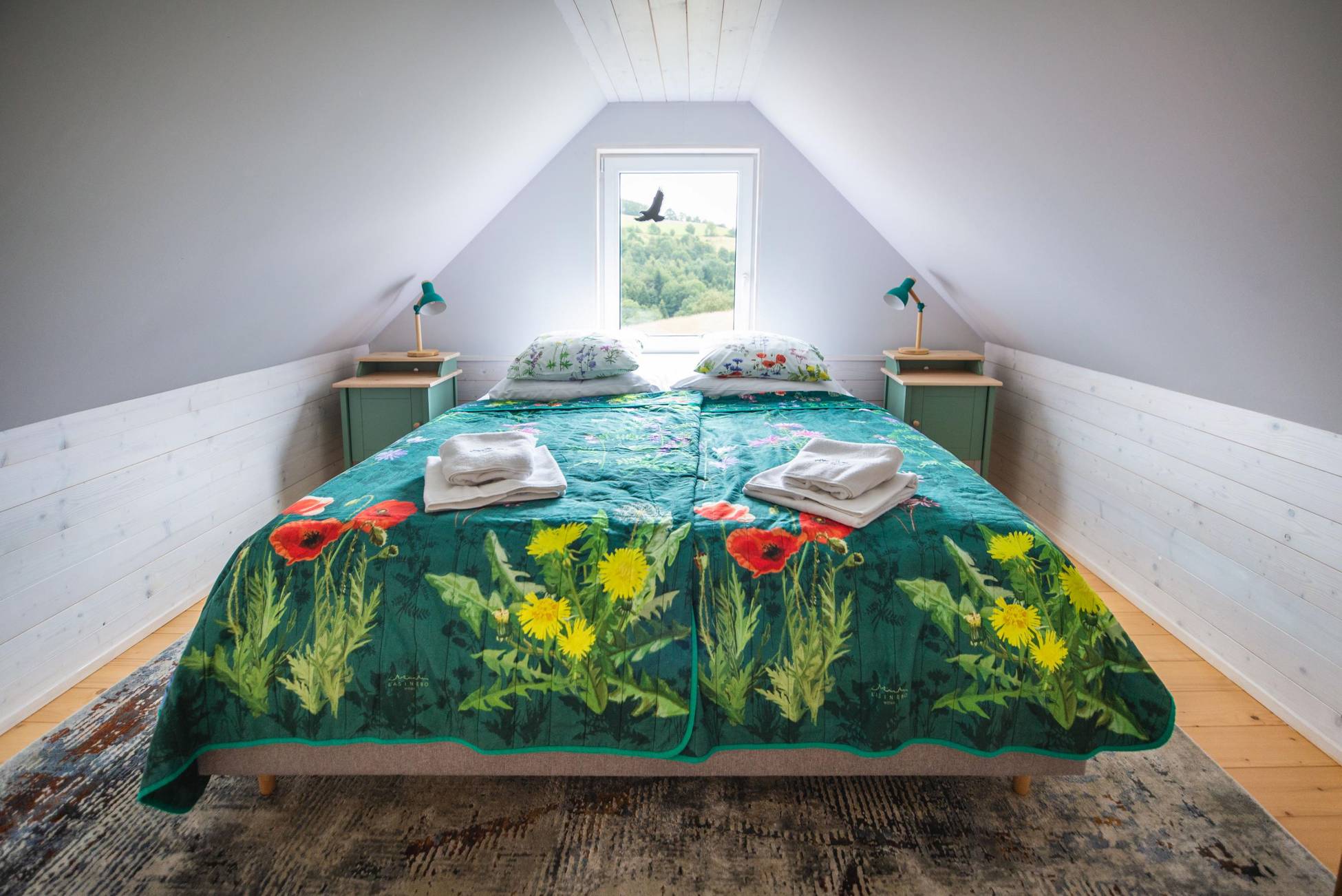 Dom „Słonecznik” jest idealnym miejscem dla grup do dwunastu osób. 60 mkw otwartej przestrzeni z trzema pokojami, dużym tarasem, kuchnią oraz wspólną łazienką. Dom Zielnik pomieści natomiast ok 10 osób zakwaterowanych w trzech 3osobowych pokojach z łazienkami. Do tego ogromna otwarta przestrzeń z widokowym tarasem oraz kominkiem połączona z kuchnią.