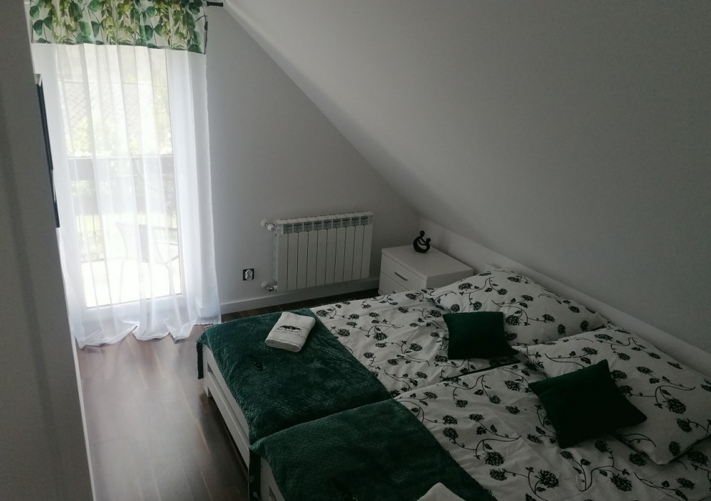 • Pokój nr 4: Dwuosobowy z łóżkiem małżeńskim i wspólną łazienką. Posiada wyjście na taras z widokiem na Ćwilin.